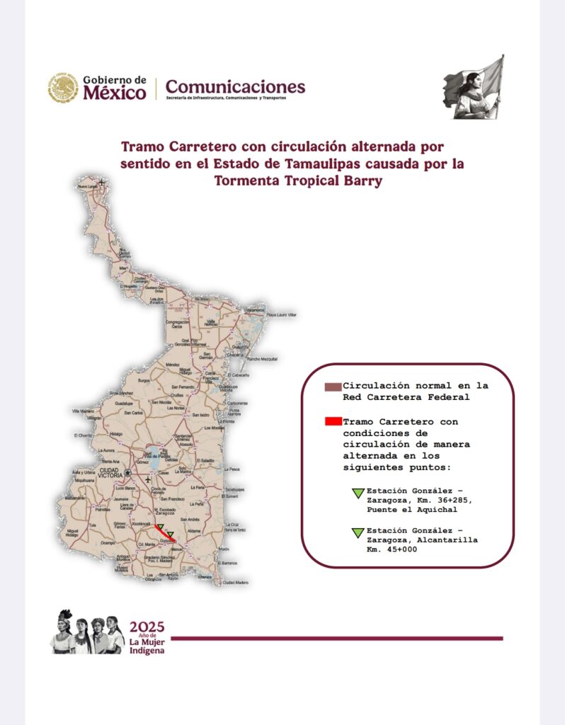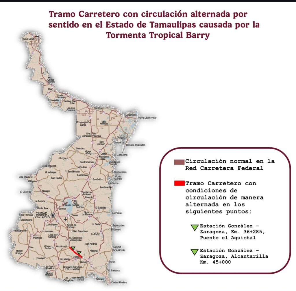 Asimismo, se sugirió a los automovilistas considerar rutas alternas si se viaja de Tampico a Victoria: González – Mante – Xicoténcatl – Zaragoza – Ciudad Victoria.