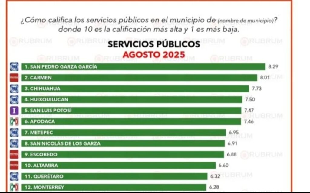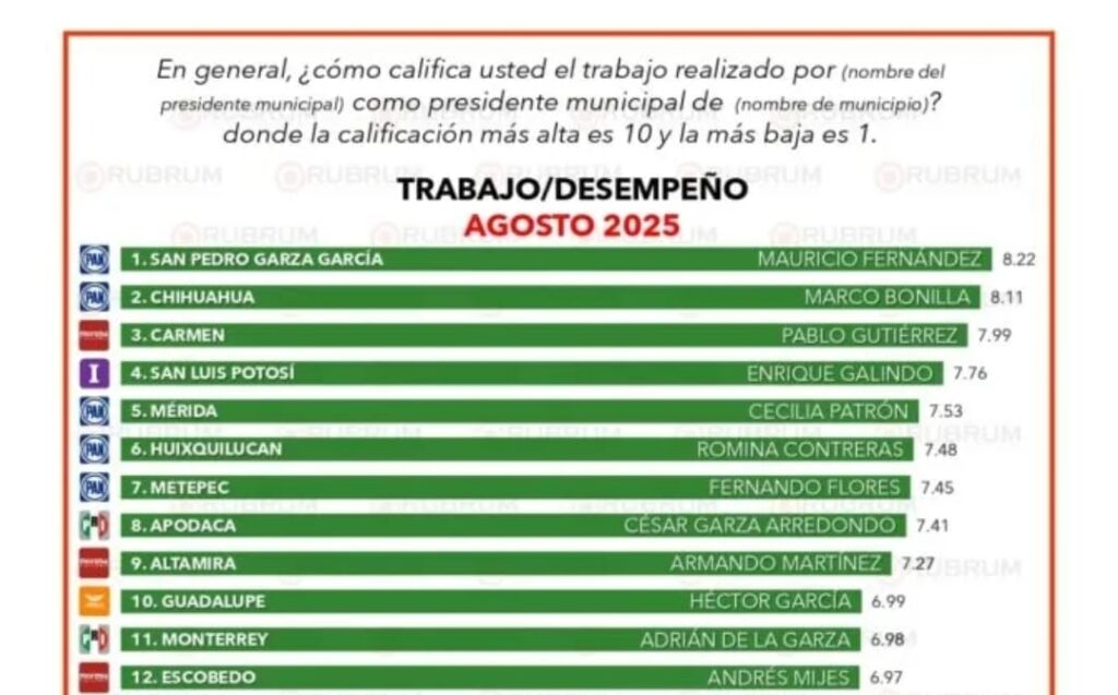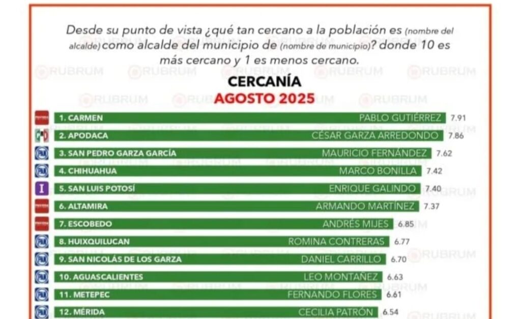 La empresa RUBRUM dio a conocer los resultados de la encuesta de Evaluación de Alcaldes correspondiente a este mes de agosto de 2025