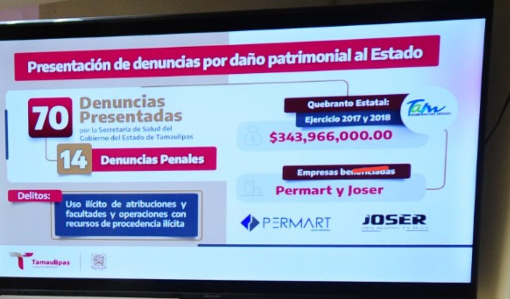 «Se estima un quebranto aproximado de 343 millones 966 mil pesos; esas cantidades de dinero fueron pagadas a dos empresas que están vinculadas a los hermanos Carmona, en donde las empresas que fueron beneficiadas son Grupo Industrial Permart, representada por Julio César Carmona Angulo, y Grupo Industrial Joser, representada por Carlos Alejandro Romero Guerra”, precisó en conferencia de prensa el director jurídico y apoderado legal de la Secretaría de Salud de Tamaulipas, Iván Saldaña Magaña.