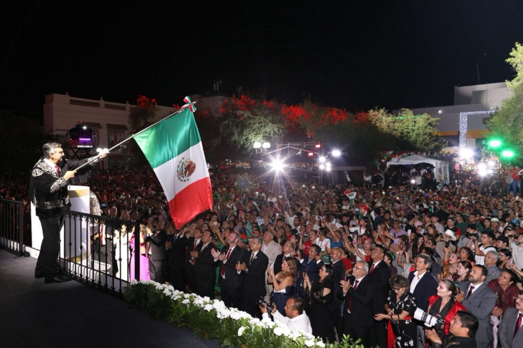 Ciudad Victoria, Tamaulipas. – Miles de familias tamaulipecas se congregaron en la Plaza Juárez de esta capital para conmemorar el 215 aniversario del Grito de Independencia, acto encabezado por el gobernador Américo Villarreal Anaya, quien en su arenga vitoreó a nuestros hermanos y hermanas migrantes, a la honestidad y la justicia, y a los independentistas tamaulipecos.