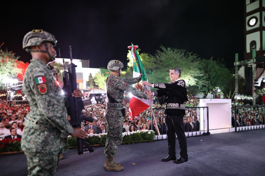 Desde la escalinata principal de Palacio de Gobierno, el gobernador de Tamaulipas recibió la bandera nacional de manos de la escolta del 77 Batallón de Infantería y exclamó.