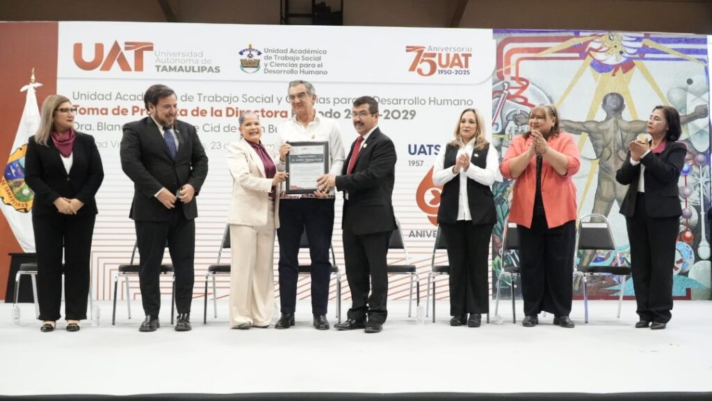 Teniendo como testigo de honor al gobernador Américo Villarreal Anaya, el rector de la Universidad Autónoma de Tamaulipas (UAT), Dámaso Anaya Alvarado, le tomó protesta a la nueva directora de la Unidad Académica de Trabajo Social y Ciencias para el Desarrollo Humano (UATSCDH), Dra. Blanca Guadalupe Cid de León Bujanos, quien asume el cargo para el periodo 2025-2029.