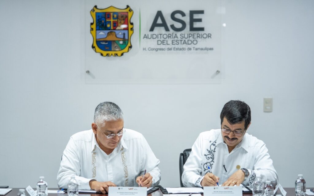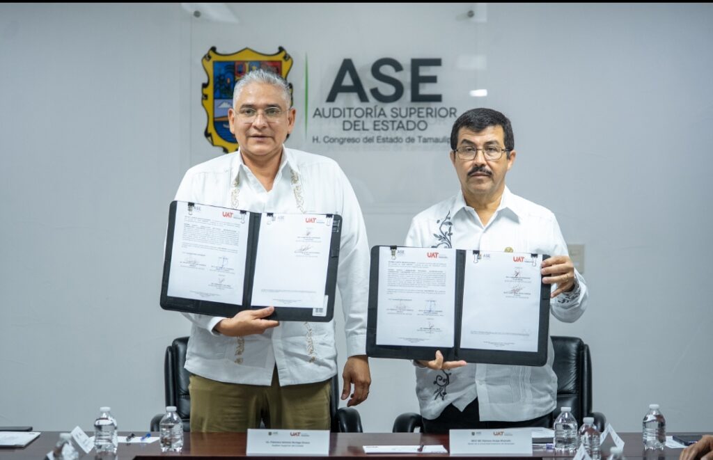 El rector de la Universidad Autónoma de Tamaulipas (UAT), Dámaso Anaya Alvarado, y el titular de la Auditoría Superior del Estado de Tamaulipas (ASE), Francisco Antonio Noriega Orozco, presidieron la firma del convenio marco de colaboración con el propósito de establecer una alianza estratégica que fortalezca la cooperación académica, técnica y profesional.