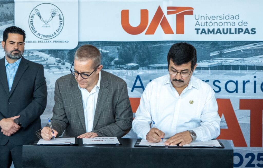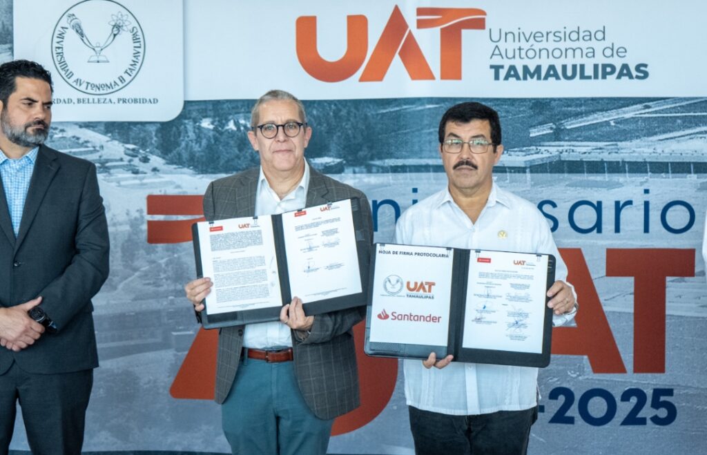 Con el propósito de consolidar alianzas estratégicas que impulsen el desarrollo académico, tecnológico y social de la comunidad universitaria, la Universidad Autónoma de Tamaulipas (UAT) suscribió el convenio marco de colaboración con Banco Santander México, en una ceremonia encabezada por el rector Dámaso Anaya Alvarado, y el director ejecutivo de Santander Universidades, Arturo Cherbowski Lask.