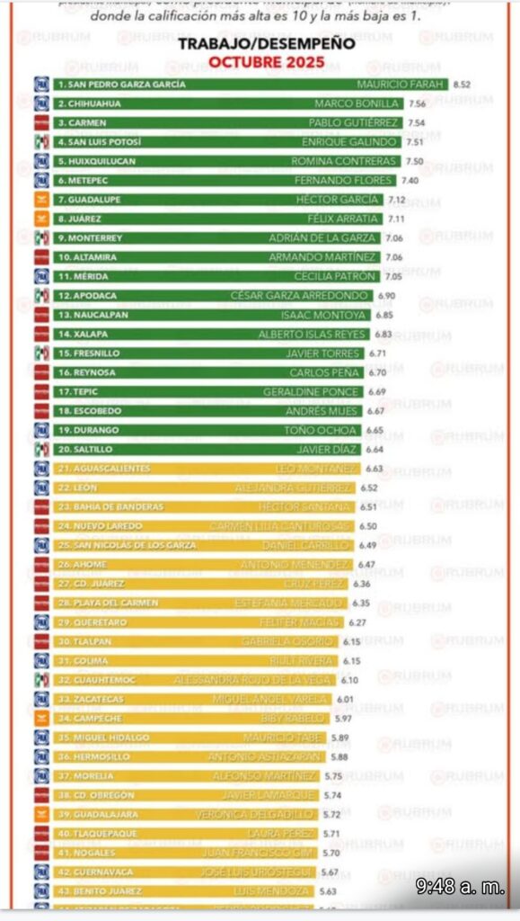 El estudio, realizado por la firma especializada en análisis de opinión pública, colocó al alcalde altamirense como el mejor calificado en Tamaulipas y entre los diez primeros lugares a nivel nacional en rubros clave como desempeño general, calidad de los servicios públicos, cercanía con la ciudadanía y percepción de seguridad.