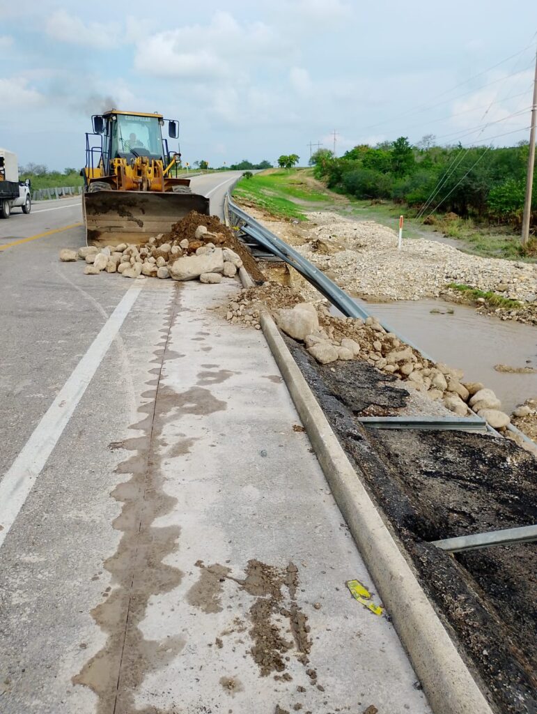 Ciudad Madero, Tamaulipas.- Apenas se reportaron los daños en los tramos carreteros a causa de las lluvias, la Secretaría de Obras Públicas del Estado en coordinación con la Secretaría de Infraestructura, Comunicaciones y Transportes del Gobierno Federal inició de inmediato los trabajos y movilizó maquinaria pesada, personal y materiales para reparar las afectaciones.