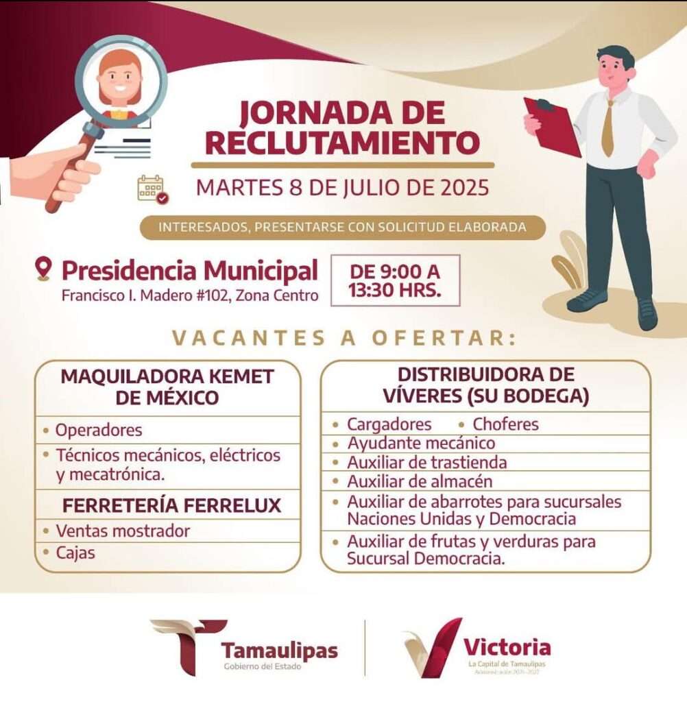 Seguimos comprometidos en generar y gestionar oportunidades laborales para todos los victorenses, te invitamos a participar en nuestra jornada de reclutamiento este próximo martes 8 de julio.