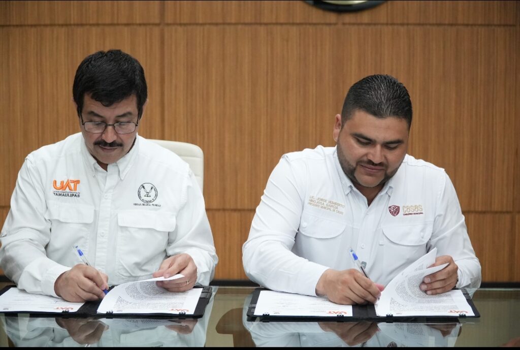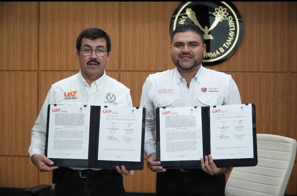 El rector de la Universidad Autónoma de Tamaulipas (UAT), Dámaso Anaya Alvarado, encabezó la firma de un Convenio Marco de Colaboración con el alcalde del municipio de Casas, Jorge Humberto Hinojosa García.