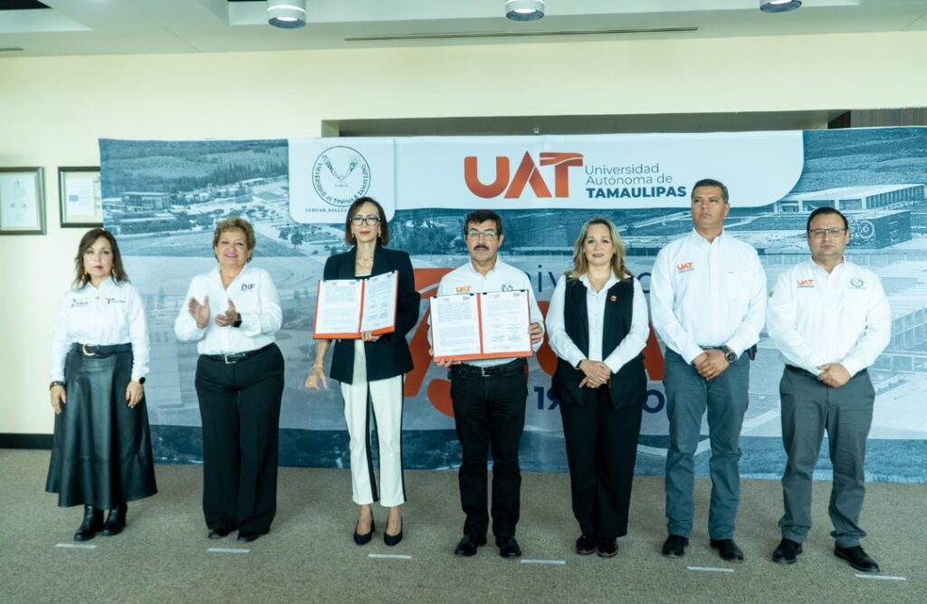El rector Dámaso Anaya Alvarado firmó el acuerdo con la directora general del Sistema DIF Tamaulipas, Patricia Eugenia Lara Ayala, teniendo como testigo de honor a la directora general del Instituto Tamaulipeco de Capacitación para el Empleo (ITACE), Claudia Anaya Alvarado.