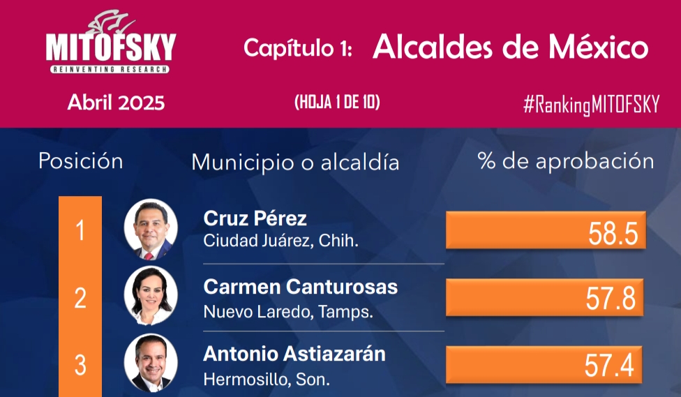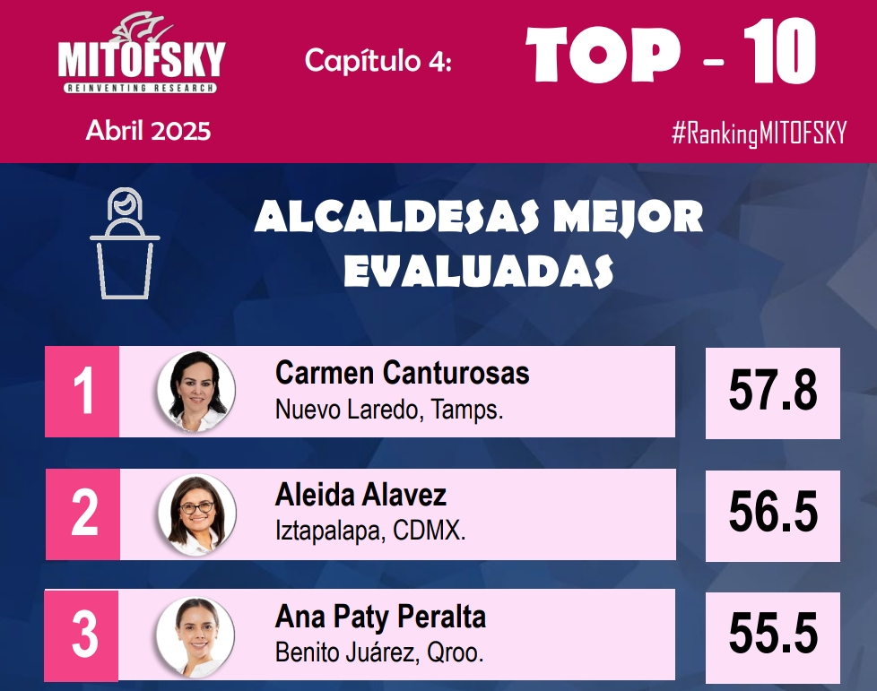 Y es que le cuento que en el mes de abril de 2025 una vez más Carmen Lilia Canturosas Villarreal fue la alcaldesa mejor evaluada en México Con el 57.8% y por consiguiente de Tamaulipas de acuerdo a una encuesta de Consulta Mitofsky publicada en el periódico de circulación nacional EL ECONOMISTA.