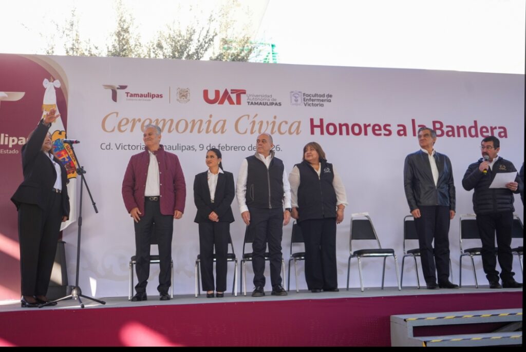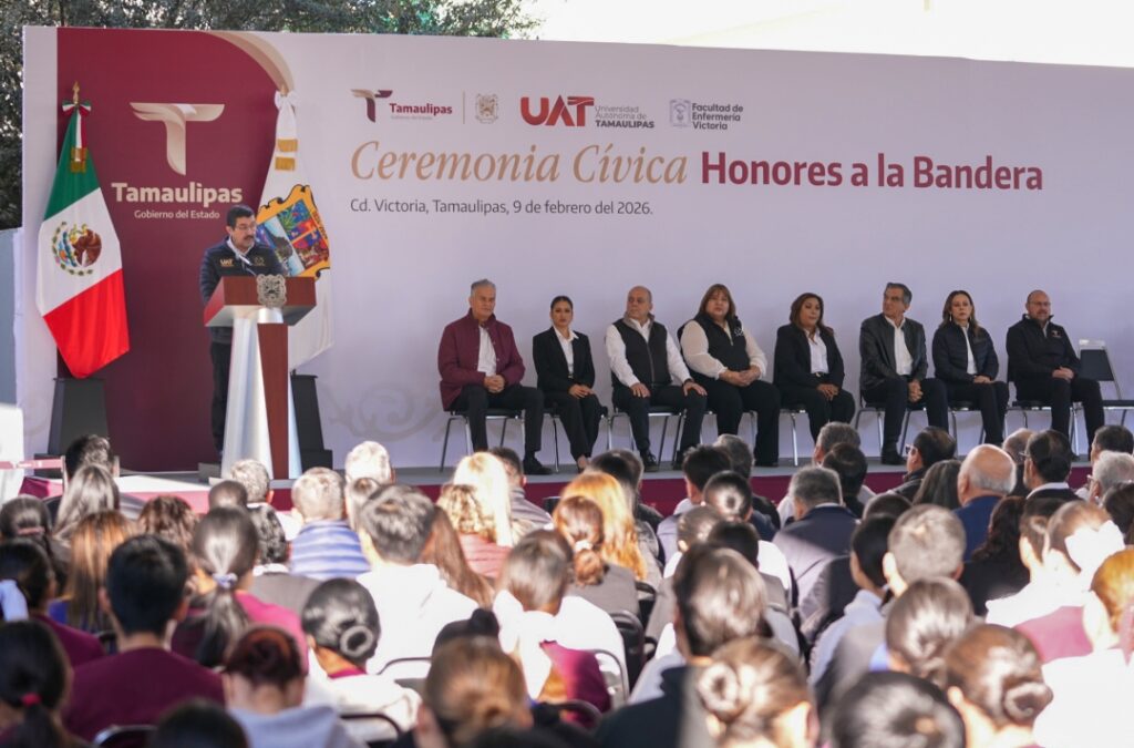 El gobernador Américo Villarreal Anaya, junto con el rector de la Universidad Autónoma de Tamaulipas (UAT), Dámaso Anaya Alvarado, encabezó este lunes la ceremonia de honores a la bandera y atestiguó la toma de protesta de la Dra. María Guadalupe Vázquez Salazar como directora de la Facultad de Enfermería Victoria para el periodo 2026-2029.