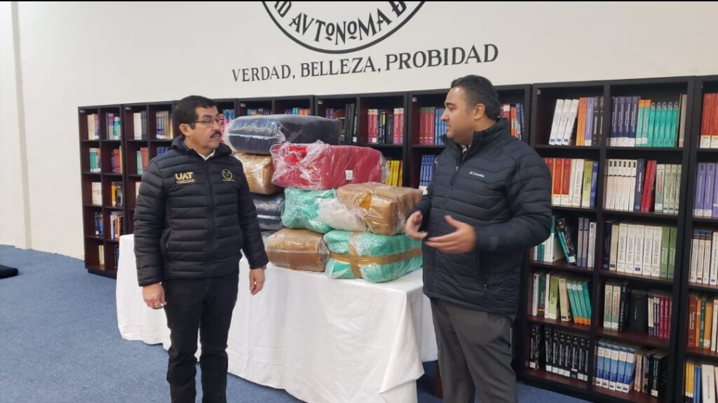 Acompañado por el director de la Facultad, René Adrián Salinas Salinas, el rector visitó el espacio habilitado como refugio en el auditorio del plantel, donde resaltó la colaboración de la Universidad con el gobierno estatal y municipal para servir a la sociedad no solo en lo académico, sino también en contingencias ambientales como las que se han presentado en esta temporada invernal.