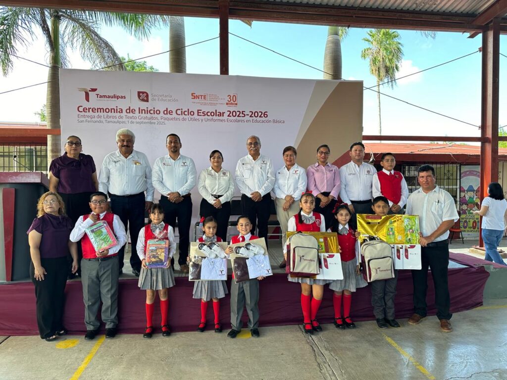San Fernando, Tamaulipas.- En representación del gobernador Américo Villarreal Anaya, el Secretario de Desarrollo Rural, Pesca y Acuacultura, Antonio Varela Flores, puso en marcha las actividades del ciclo escolar 2025-2026 en la escuela Primaria Antonio Beltrán Gracia, ubicada en el municipio de San Fernando.