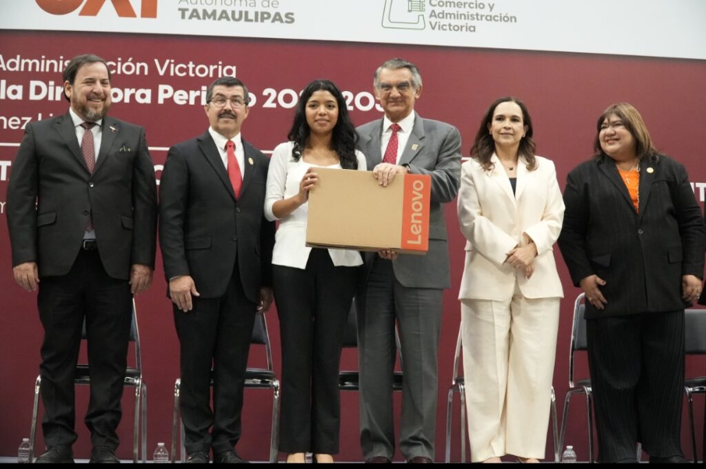 En este marco, hicieron entrega de computadoras portátiles a estudiantes de las facultades, unidades académicas y preparatorias de la UAT de Ciudad Victoria y Ciudad Mante, con el objetivo de fortalecer sus herramientas de aprendizaje.